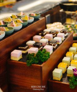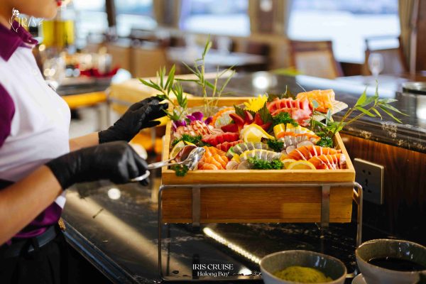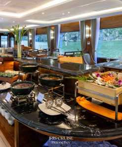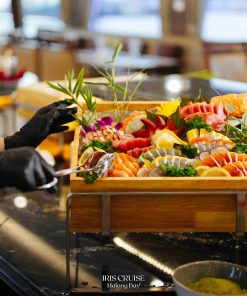 Đoàn dùng buffet tối thượng hạng với hải sản Hạ long, cá Hồi, cá Ngừ, cá Trích và đặc biệt món Sườn nướng ngũ vị trứ danh chỉ có trên du thuyền Iris Cruise. Phụ thu cho menu Tôm Hùm 350,000 VND cho ½ con và cần đặt trước.