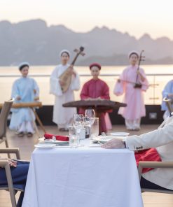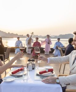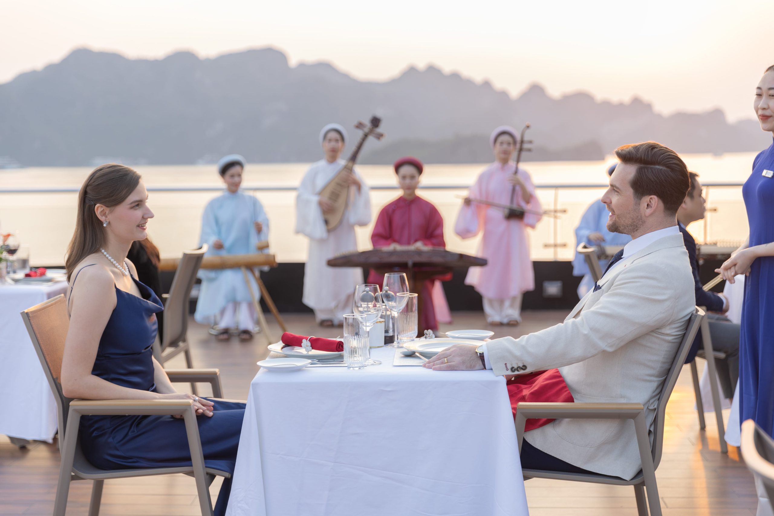 Ngắm nhìn toàn cảnh Vịnh Di Sản, tận hưởng nhạc sống và bắn pháo hoa sau bữa tối.