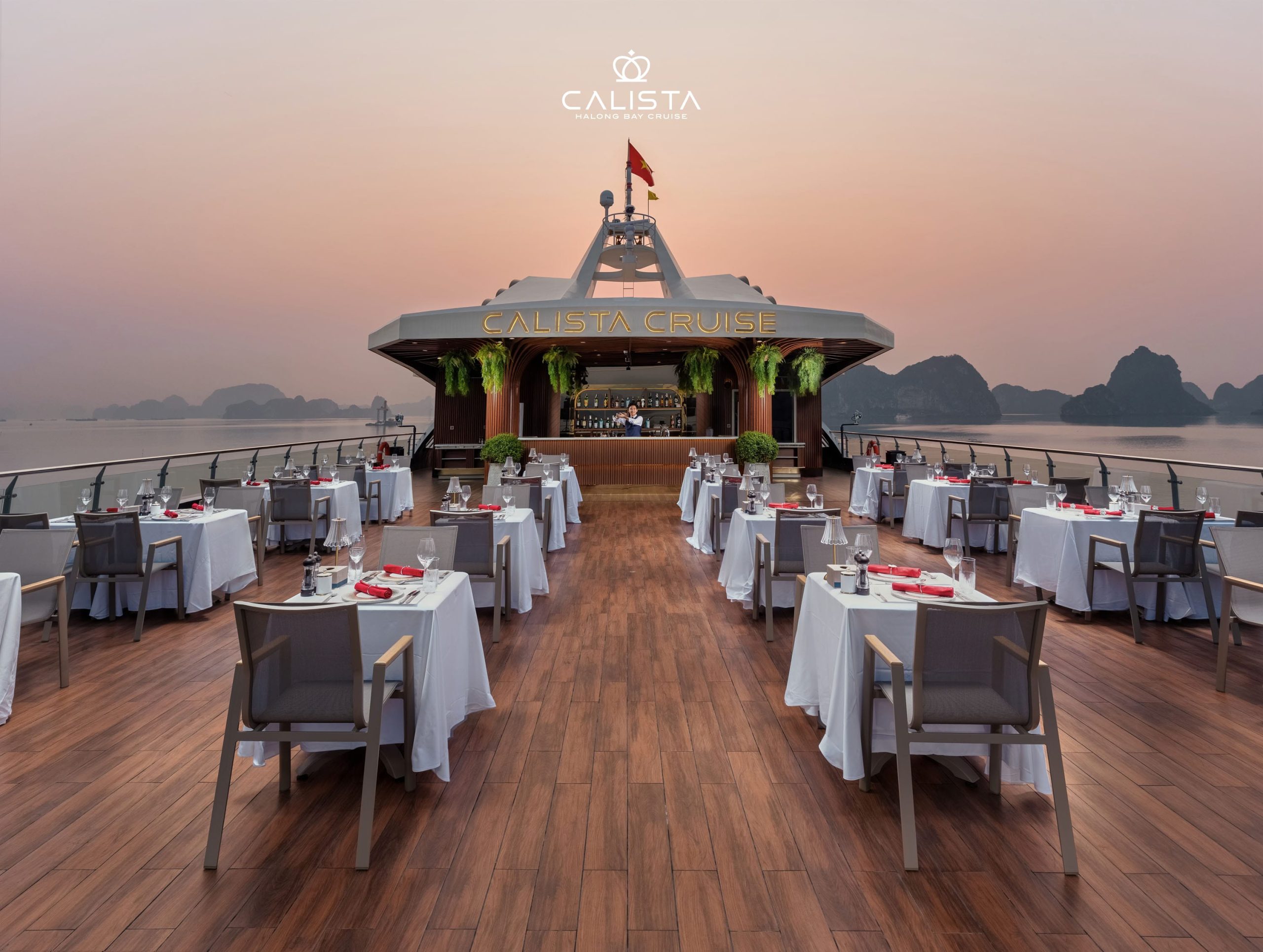 Thư giãn khi hoàng hôn buông xuống Vịnh Hạ Long. Thưởng thức “Tiệc Trà Chiều” hoặc đồ uống yêu thích tại Calista Breeze Bar. Tận hưởng chương trình Happy Hour “Mua 2 Tặng 1” từ 17:30 đến 18:30 với những thức uống đặc biệt chỉ có tại Calista Cruise được phục vụ kèm đồ ăn nhẹ.