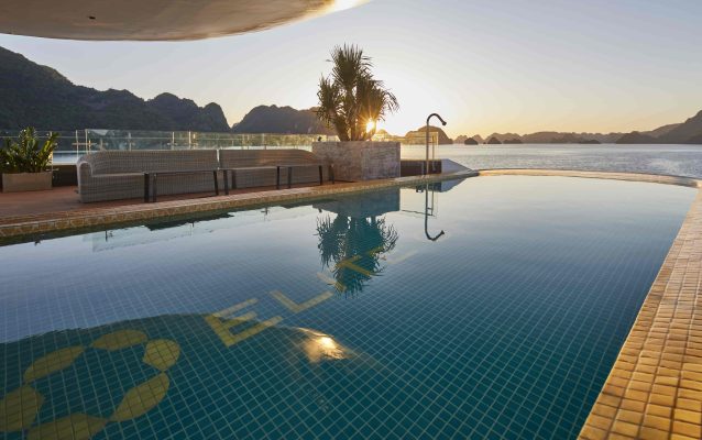 Du thuyền có thiết kế với kiến trúc hiện đại, sang chảnh và tích hợp nhiều tiện ích như một khách sạn hạng sang trên biển như quầy bar, hầm rượu và xì gà, bể bơi vô cực, sân golf mini, và spa xông hơi. Bể bơi vô cực trên tàu thuộc hàng lớn nhất trên vịnh Hạ Long với diện tích 50m2. Bạn có thể trải nghiệm đồ uống ngay ở quầy bar cạnh bể bơi.